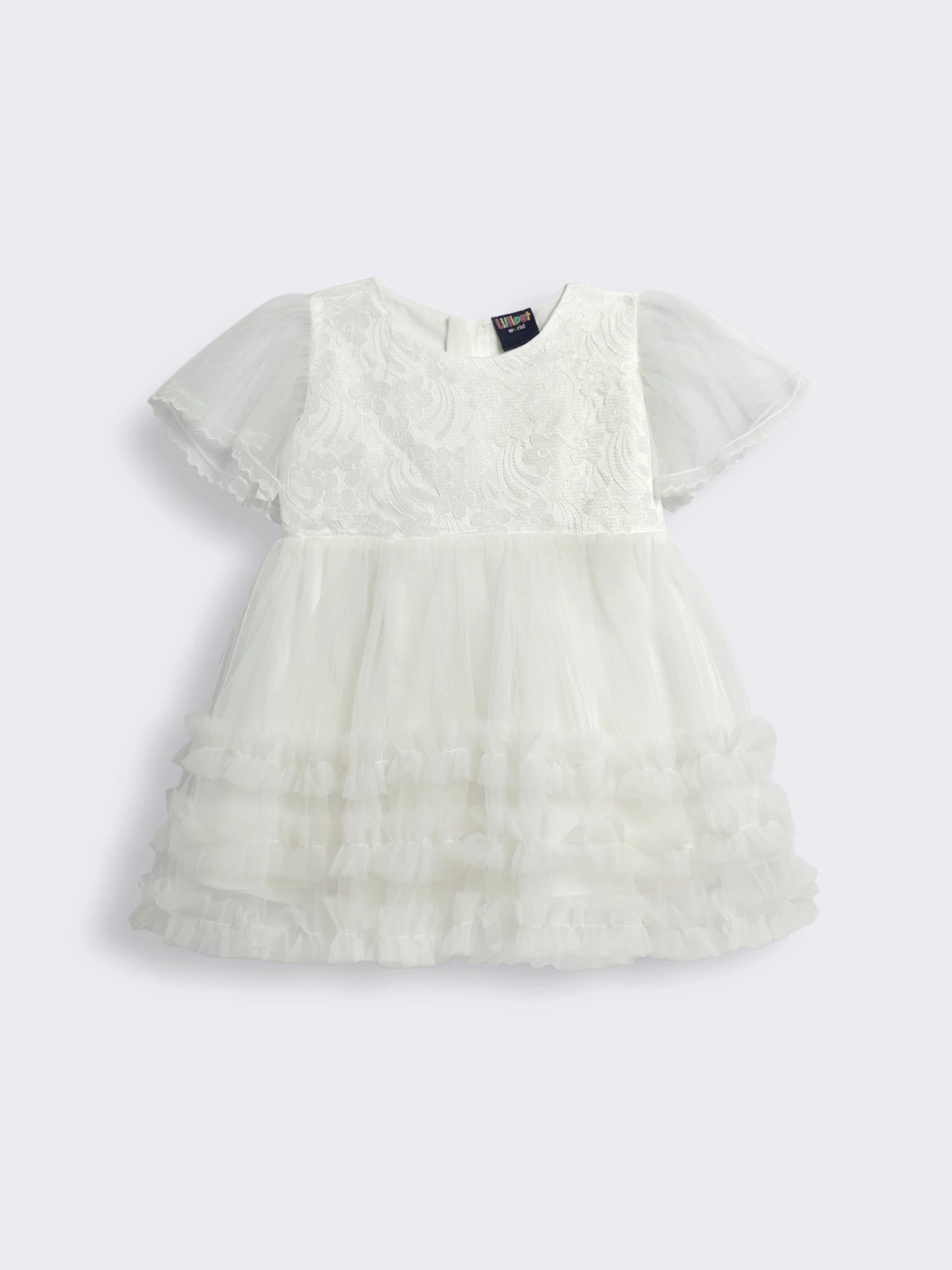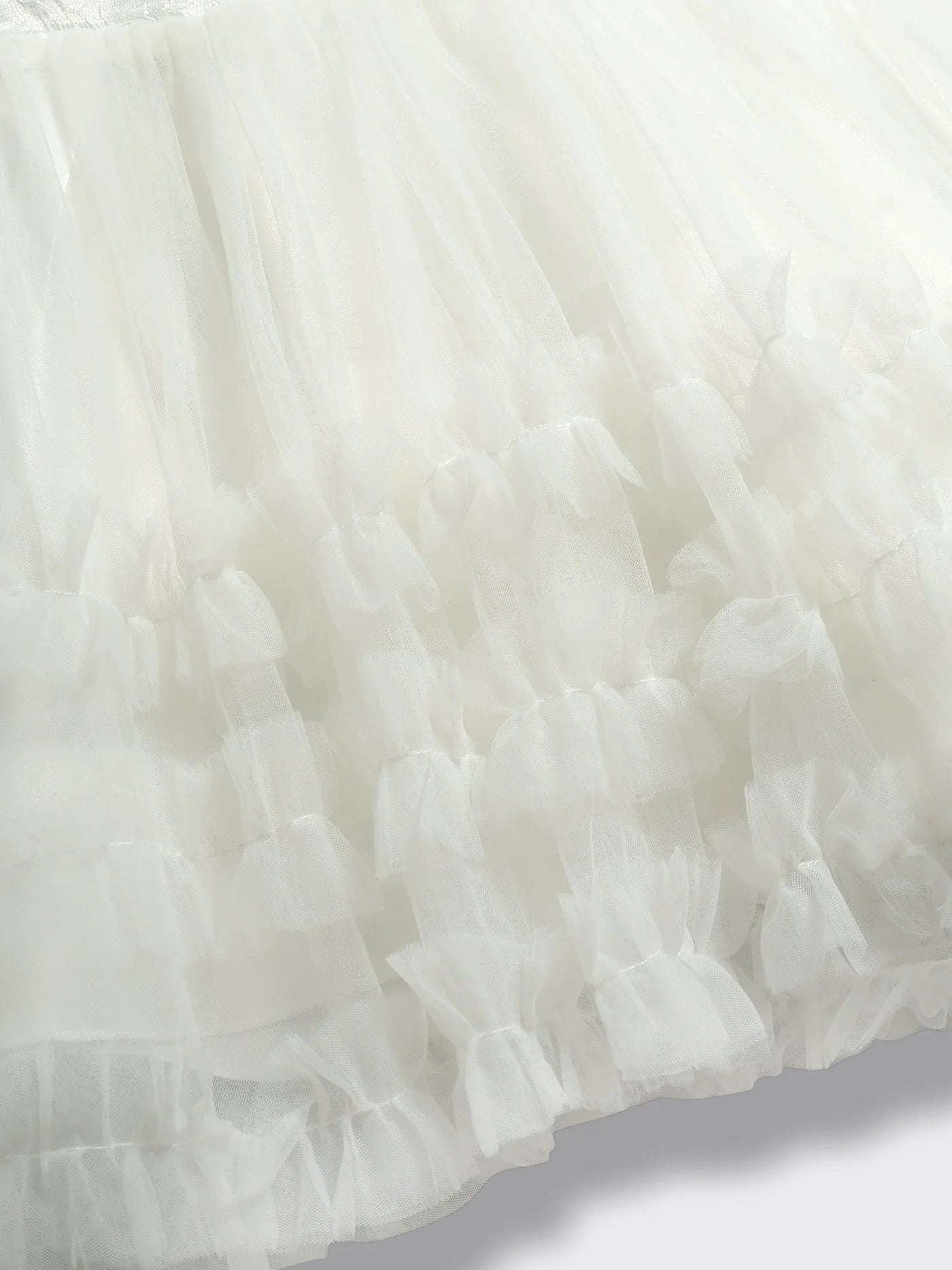 This white girls net party dress with ruffles is a dreamy addition to any festive wardrobe. Designed with delicate net layers and ruffled detailing along the hem, it creates a soft, floaty silhouette perfect for twirling. The lace bodice adds a touch of sophistication, while the short puff sleeves and smooth inner lining ensure comfort, breathability, and durability throughout the celebration. White ruffle party dress; Girls net gown; Lace bodice dress; Elegant birthday dress; Layered tulle frock; Comfortable festive wear; Fancy kids dress; Twirl-ready party outfit