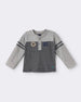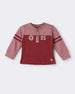 This red boys cotton T-shirt combines sporty charm with everyday comfort. Made from soft and breathable 100% cotton, it features horizontal stripe detailing and a Henley-style button placket for a cool, casual look. The printed patch and number graphic add a playful touch, while the full sleeves make it perfect for layering during cooler days. Ideal for school, playdates, or relaxed weekends. Boys cotton t-shirt; Red striped t-shirt; Henley neck kidswear; Full-sleeve casual shirt; Stylish boys top; Comfortable cotton tee