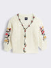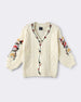 This cream girls sweater with embroidered sleeves brings a touch of whimsy to winter fashion. Featuring colorful mushroom and floral embroidery along the sleeves and neckline, this cozy knit has a classic cable pattern and a relaxed V-neck fit for easy layering. Perfect for chilly days, it adds warmth and playful charm to any outfit. White embroidered girls sweater; Cable knit cardigan; Mushroom sleeve sweater; Girls floral embroidery knitwear; Cozy winter cardigan; V-neck embroidered sweater; Stylish girls knit sweater