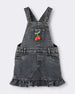 Add a fun twist to your little girl’s casual wardrobe with this black denim dungaree dress. Featuring a cute cherry embroidery on the front pocket and ruffled hem detailing, this dress blends charm with everyday practicality. Crafted from soft, durable cotton denim, it ensures all-day comfort and flexibility. Perfect for layering over tees or tops, this dungaree dress is ideal for playdates, outings, or weekend adventures. Enzyme and silicone treated wash, keeps denim strong, soft, and sustainable. Girls denim dungaree dress; Black denim dress; Kids dungaree outfit; Girls casual wear; Embroidered dungaree; Ruffle hem denim dress