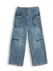 These light blue girls cargo style denim jeans bring a trendy edge to casual dressing. Designed with multiple flap and zip pockets for a utility-inspired look, they offer both functionality and fashion. The relaxed fit and faded wash add to the denim’s charm, making it perfect for pairing with tees or hoodies for an effortlessly cool outfit.Enzyme and silicone treated wash, keeps denim strong, soft, and sustainable.Girls cargo jeans; Light blue denim jeans; Utility pocket jeans; Girls casual denim; Multi-pocket jeans; Stylish denim trousers