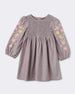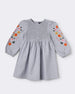 This grey girls cotton smocked dress features elegant floral embroidery on the sleeves, long sleeves with elastic cuffs, and a round neck with a beautifully smocked yoke. Made from soft, breathable cotton, it is comfortable, breathable, and durable, ensuring ease of movement and lasting comfort. Perfect for casual wear, daily wear, playwear, party wear, festive wear, and family outings, this dress blends timeless style with everyday charm.Girls cotton embroidered dress; Grey long sleeve smocked dress; Cotton breathable kids dress; Comfortable durable cotton dress; Stylish floral embroidered dress girls; Trendy everyday cotton dress; Casual festive wear girls dress; Grey smocked cotton kids outfit