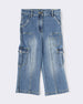 Add a rugged edge to your little one’s style with these blue girls denim cargo pants. Crafted from soft yet durable denim, these pants feature multiple utility pockets, buttoned flaps, and stitch detailing for a trendy, casual look. The comfortable waistband ensures an easy fit, making them perfect for active days or casual outings. Pair them with tees or shirts for a cool, everyday outfit. Enzyme and silicone treated wash, keeps denim strong, soft, and sustainable. Girls denim pants; Kids cargo jeans; Blue denim trousers; Girls utility jeans; Casual kidswear; Denim cargo bottoms