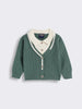 This green boys contrast collar sweater brings a preppy twist to winter dressing. Designed with a cream contrast collar & classic cable knit texture, it adds both charm and warmth. The button-down front makes it easy to layer over shirts or tees for a polished yet cozy look — perfect for outings or family gatherings. Green toddler boys sweater; Contrast collar knitwear; Boys button-down cardigan; Striped hem sweater; Boys winter fashion; Cable knit cardigan for kids; Stylish boys outfit