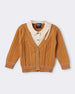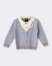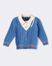 This blue boys contrast collar sweater brings a preppy twist to winter dressing. Designed with a cream contrast collar, classic cable knit texture, and striped detailing on the cuffs and hem, it adds both charm and warmth. The button-down front makes it easy to layer over shirts or tees for a polished yet cozy look — perfect for outings or family gatherings. Blue boys sweater; Contrast collar knitwear; Boys button-down cardigan; Striped hem sweater; Boys winter fashion; Cable knit cardigan for kids; Stylish boys outfit