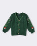 This green girls sweater with embroidered sleeves brings a touch of whimsy to winter fashion. Featuring colorful mushroom and floral embroidery along the sleeves and neckline, this cozy knit has a classic cable pattern and a relaxed V-neck fit for easy layering. Perfect for chilly days, it adds warmth and playful charm to any outfit. Green embroidered girls sweater; Cable knit cardigan; Mushroom sleeve sweater; Girls floral embroidery knitwear; Cozy winter cardigan; V-neck embroidered sweater; Stylish girls knit sweater